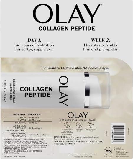 Powerful and Fragrance -Free Moisturizer Our skin deserves plumping moisture, so give it OLAY Collagen Peptide 24 Facial Moisturizer Cream. We're giving you transformative Collagen Peptide in this powerful and fragrance-free face moisturizer. Lightweight formula This lightweight formula absorbs quickly, giving you 24 hours of hydration without a sticky, greasy or heavy feeling. It's specifically formulated with tried-and-true ingredients, like Collagen Peptide and Niacinamide, to transform the look of your skin. And the longer you use this face moisturizer, the better your skin will look and feel. Noticeable Smooth & Firm Skin On day 1, your skin's texture will look smooth. With two weeks of use, your skin will look and feel visibly firmer and your fine lines and wrinkles will be less noticeable. And are you ready for more? This powerful cream is proven to hydrate better than the $400 cream. To use, just smooth on morning and night for visibly firm skin. Olay Skin Promise As a part of Olay's commitment to responsible beauty this face moisturizer is Dermatologist tested and formulated with clean ingredients meaning no fragrance, parabens, phthalates or synthetic dyes. Stand up for ingredients you believe in and stand firm with your skin with OLAY Collagen Peptide 24. Our OLAY Skin Promise to you is zero skin retouching in all advertising. OLAY is the first mass skin care brand in the US to take this stance, because we know real beauty is honestly beautiful.