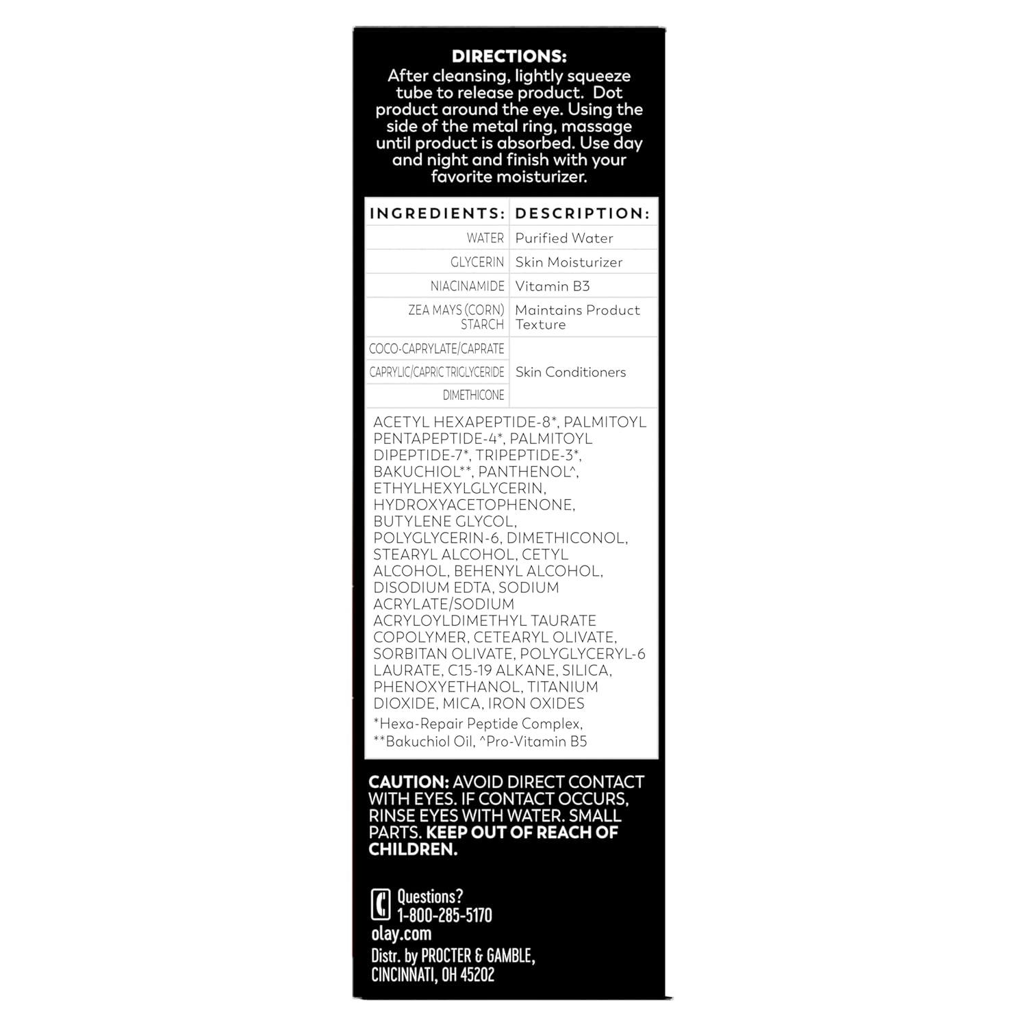 Transform Your Eyes with Clinically Proven Results Discover the secret to youthful, radiant eyes with our fragrance-free, professional-grade ingredient treatment. Specifically formulated to target expression lines and wrinkles, our advanced eye treatment delivers visible results without the need for invasive procedures. Instant Results, Lasting Beauty Day 1: Feel the instant hydration and see brightness around your eyes. Our formula starts working from the first application, giving your skin a refreshed and revitalized look. Day 14: Notice a significant lift and firmness in the delicate eye area. Your skin will appear tighter and smoother, enhancing your natural contours. Day 28: Experience a dramatic reduction in deeper-set wrinkles and expression lines, revealing a more youthful and rejuvenated appearance.Powerful Ingredients for Proven Results Hexa-Repair Peptide Complex: A unique blend of Olay's Triple Collagen Peptide and breakthrough Hexa-Peptide, designed to improve the look of wrinkles and combat volume loss. Bakuchiol: A naturally derived retinol alternative that promotes radiance against free radical damage, helping to prevent signs of aging. Why Choose Our Treatment? With over 70 years of skin science expertise, our formula penetrates deep into the skin's surface, intracellularly hydrating and strengthening cellular bonding over time. Repair visible signs of aging and achieve stunning results without the downtime or expense of a procedure. Join the Skincare Revolution Embrace a future of dramatic results without drastic measures. Choose our dermatologist-recommended brand for a smoother, firmer, and more youthful eye area. Transform your skincare routine today and see the difference that professional-grade ingredients can make.”