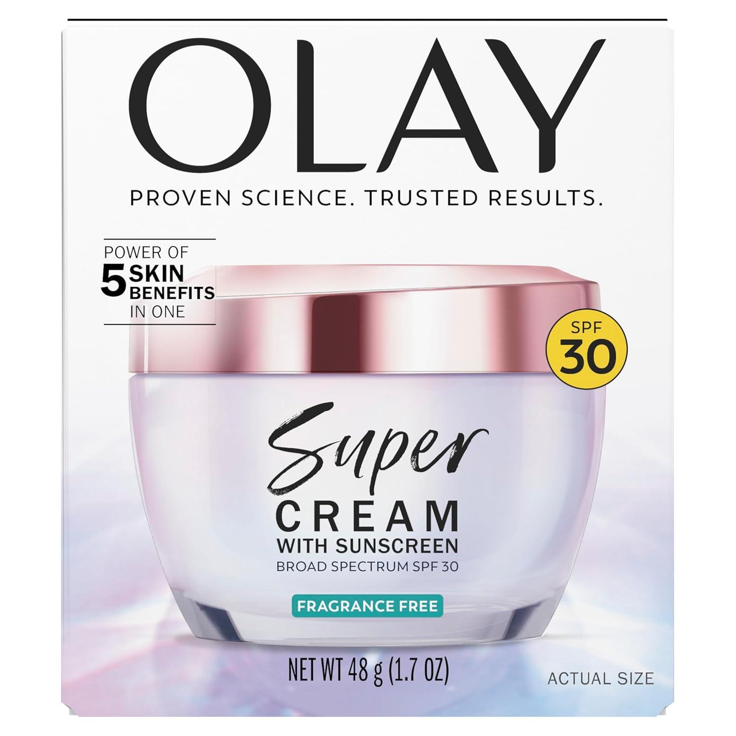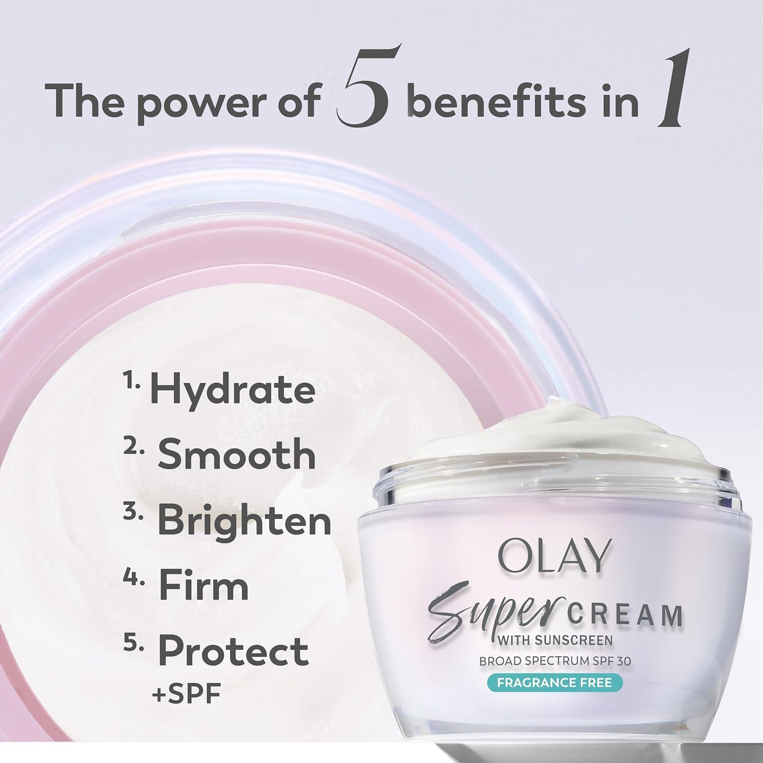 The best way to care for your skin’s future is now with fragrance free Olay Super Cream with Sunscreen. Our ultra lightweight daily SPF 30 facial moisturizer delivers 5-in-1 benefits: 1. Hydrates, 2. Smooths, 3. Brightens, 4. Firms, and 5. Protects with SPF. It doubles as a primer for face before makeup, creating a smooth base for flawless makeup application. Simplify your morning skin care routine with an all-in-one facial moisturizer, makeup primer, and sunscreen. Infused with Niacinamide, Vitamin C, Collagen Peptide, Vitamin E, and Hyaluronic Acid, this expertly crafted face moisturizer delivers everything your skin needs to stay brighter and more radiant all with one face cream. Clinically tested for 12-weeks across diverse skin types, tones, and conditions, Olay Super Cream’s formula melts into your skin, leaving no white cast and a light and airy feel without the heavy and sticky sensation of traditional sunscreen. This face cream delivers a radiant, dewy glow and a soft matte finish with every application. With continual use, this will improve skin firmness and reduce dark spots and fine lines. Pair with Olay Super Serum and Super Eye Serum today to take your skin care routine to the next level, and your skin will thank you tomorrow. Today, people are overwhelmed by endless skincare choices, trends and routines. Olay is here to simplify your daily routine with the Super Series collection— designed to deliver multitasking benefits in each product.